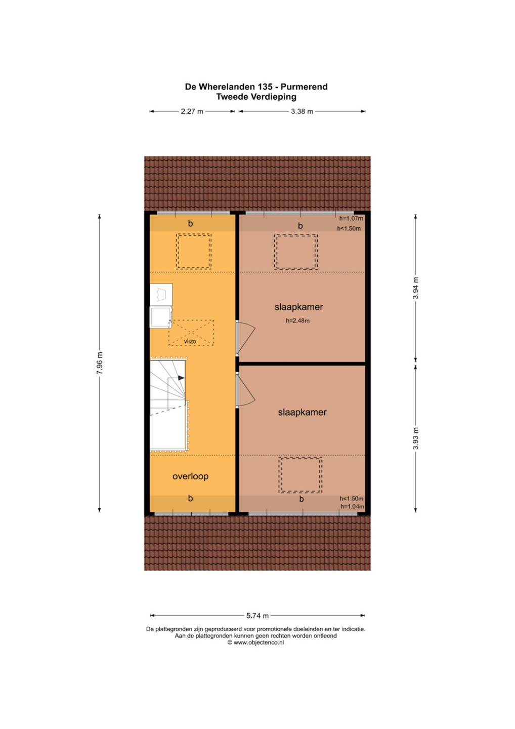 Overloop, drietal slaapkamers variërend van bijna 10 tot 16m², badkamer en separate toiletruimte.